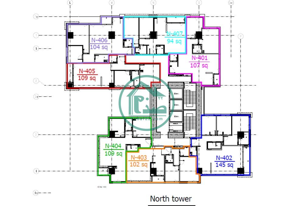 متراژ مفید هر طبقه در هر برج 760 متر مربع می باشد. در طبقات 2 تا 11 به صورت 7 واحد در هر طبقه با متراژهای 94 تا 145 متری و در طبقات 12 تا 18 در هر طبقه 6 واحد 100 تا 155 متری و در 2 طبقه آخر به 4 واحد 160 تا 223 متری تقسیم می شود.